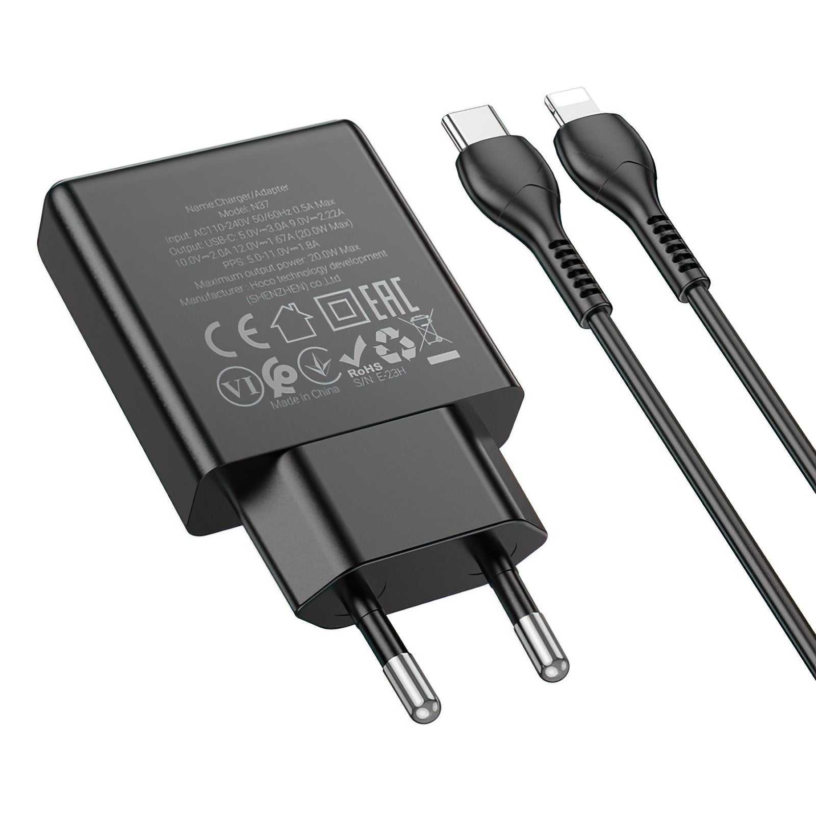 HOCO N37 Network Charger with Lightning Cable, 30W, 3A, 1 x USB-C, Black