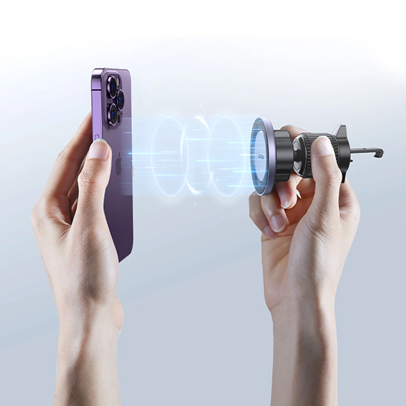 directly on the car's ventilation grill. Equipped with strong magnets, this holder keeps the phone firmly in place, even when