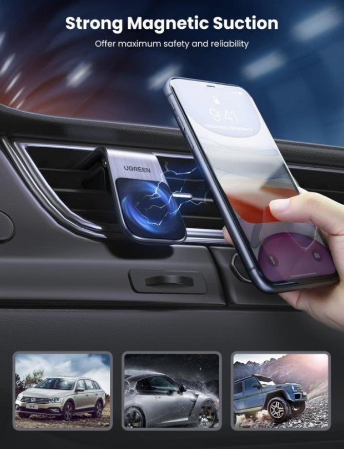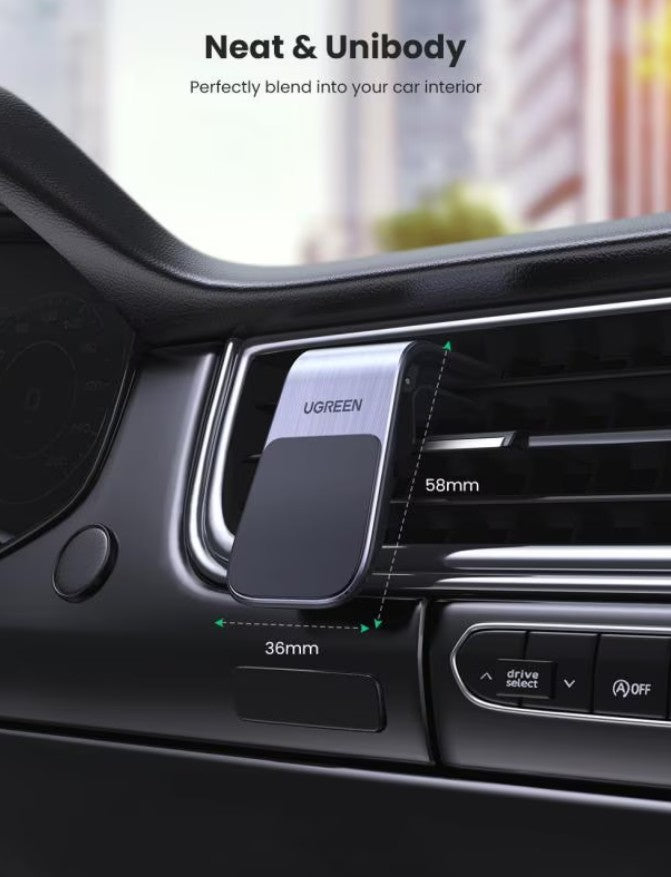 UGREEN Waterfall Magnetic Car Holder - Black The UGREEN Waterfall magnetic car holder is a compact and elegant accessory, designed to securely hold your smartphone while driving. It easily mounts on the car's ventilation grill and occupies minimal space, without obstructing visibility. Equipped with 5 strong magnets, the holder ensures a firm and stable grip for the phone, even on bumpy roads. The soft silicone surface protects the device's casing against scratches, and the intuitive design allows for quick and efficient one-handed mounting and dismounting of the phone. The package includes a metal plate, which can be stuck to the phone or inserted in the case, to ensure compatibility with any smartphone model. Features: - Mounting: On the ventilation grill - Grip: 5 strong magnets for increased stability - Contact surface: Soft silicone - prevents scratches - Compatibility: Any phone with a metal plate applied or compatible case - Operation: Easy to use with one hand Package contents: - Holder - Metal plate x 2 - Ventilation Mount